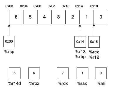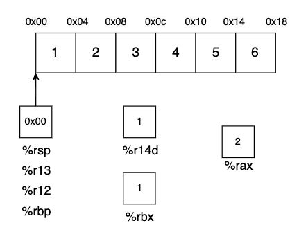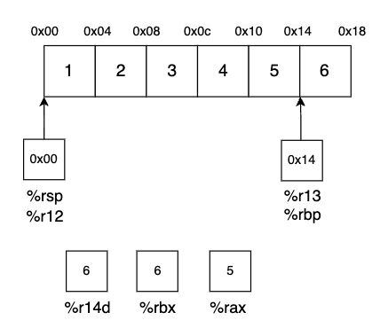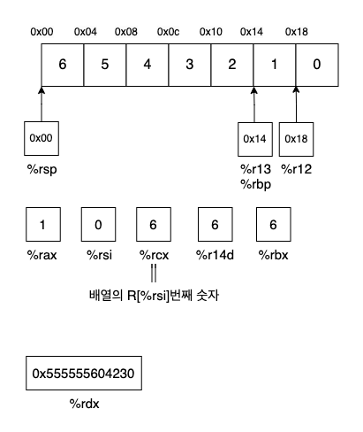 결론적으로 %rdx가 가리키는 index (R[%ecx] - 1) 값을 우리가 저장한 배열 오른쪽에 저장해놓는겁니다.