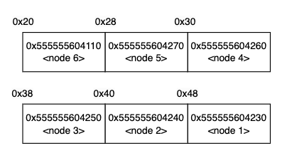 node 배열에서 한번 이동 : M[0x555555604230 + 0x8] 이 저장된다. 즉 0x555555604240가 저장된다.